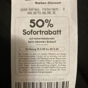 Bei Netto MD in 56068 kann man an der Kasse Rabattcoupons bekommen, mit denen die Adventskalender nur die Hälfte kosten. Ob andere Filialen diese Gutscheine ausgeben, bitte in Kommentaren melden.