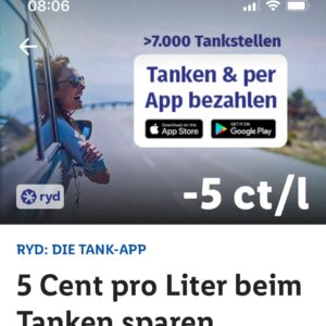 wer Lidl Plus hat ( oder sich noch eigen Account anlegt), kann dort einen Gutschein für 5ct/liter b er I’m tanken mit ryd bekommen.