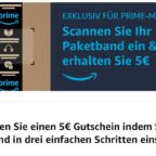 (Falls man kein Paketband auf der Kartonage hat , aber per „Verkauf&Versand durch Amazon“ bestellt hat kann man dennoch die 5€ abstauben. Dazu muss man nur innerhalb der nächsten 24-48 Std. auf Amazon.de/paketband gehen, da wird dann ein digitales Paketband angezeigt dass man in der Amazon App einscannen kann)