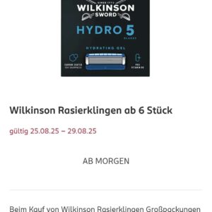 Beim Kauf von Wilkinson Rasierklingen (ab 6 Stück) erhaltet ihr bei Rossmann vom 25.08.-29.08.25 einen Rabatt von 6 €.