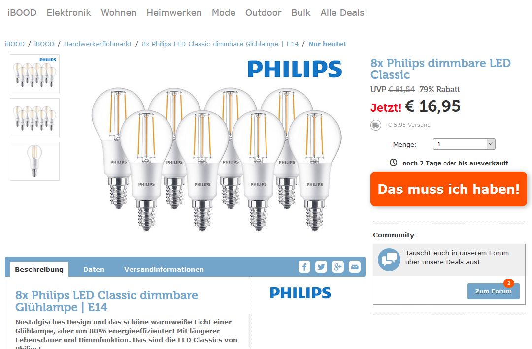Bei iBOOD bekommt ihr heute 8x Philips dimmbare LED Classic E14-Leuchtmittel für 22,90€. ( 16,95€ + 5,95€ Versandkosten )Das voraussichtliche Versanddatum für das Produkt ist der 29.04.2019.