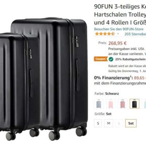 Aktuell gibt es bei Amazon (Verkauf durch 90FUN, Member of Xiaomi Ecosystem) das 3-teilige 90FUN Kofferset (S/M/L) mit 25% Rabatt für 201,71€ anstatt 268,95€. Möglich wird der Preis durch den 25% Rabattgutschein, der beim Produkt aktiviert werden kann.