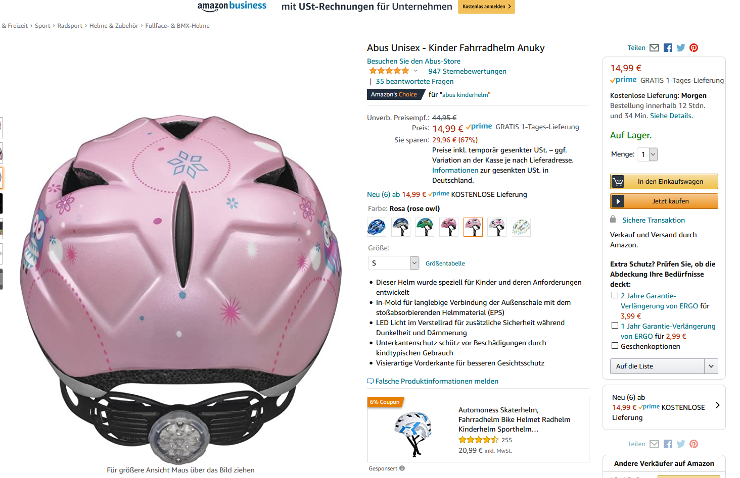 Auf Amazon bekommt ihr den Abus Kinder Fahrradhelm Anuky (größe S, Rosa) für 14,99€ inkl.Versand mit Prime statt PVG ab 33€