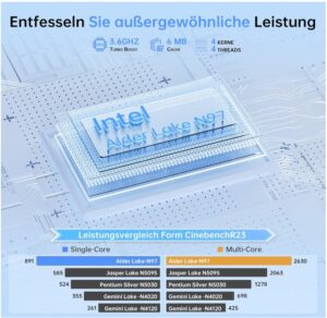 - 【12TH GEN N 97 PROCESSOR】ACEMAGIC AX17 Laptop angetrieben von der neuesten 12. Generation Alder Lake N 97 Prozessor (4C/4T, 6MB Cache, Burst-Frequenz 3,6GHz), es liefert blitzschnelle Leistung.Dieser Laptop-Computer führt über 30% besser als die N5095.Integrierte UHD-Grafik bis zu 1200MHz, mit stärkeren Grafikverarbeitungsfähigkeit, um eine reibungslose Benutzererfahrung für Arbeit, Studium und Unterhaltung.