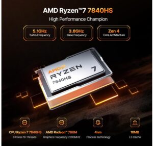 - Mini-Computer AM18 Ryzen 7 7840HS wird mit AMD Ryzen 7 7840HS (bis zu 5,1 GHz, 8C/16T, 16M Cache) geliefert, aber ACEMAGIC hat sich für das stärkste Nuclear-Display entschieden – AMD Radeon 780M für den AM18 Mini-PC. Es übernimmt die RDNA3-Architektur, die den Flaggschiff-Grafikkarten und Konsolen der nächsten Generation ähnlich ist, um eine Grafikleistung zu bieten, die mit unabhängigen Grafikkarten vergleichbar ist. Es wird mit dem hochfrequenten DDR5-Speicher gepaart, um unbegrenzte Leistung zu erreichen, und ermöglicht das Spielen von Mainstream-Spielen wie 𝐃𝐎𝐓Α𝟐, С𝐒𝟐, 𝐃е𝐚𝐝 𝐛𝐲 𝐃а𝐲𝐥𝐢𝐠𝐡𝐭, 𝐓𝐡𝐞 𝐖𝐢𝐭с𝐡е𝐫𝟑.