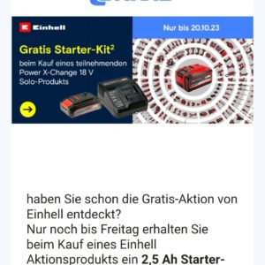 Bei Conrad bekommt man noch bis zum 20.10.2023 ein 2,5 Ah Akku Starter Kit als gratis Zugabe beim Kauf eines qualifizierten Einhell Gerätes. Einfach einmal ansehen, Geräte für Garten, Werkstatt, Reinigung.