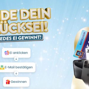 Durch Anklicken eines Ei und Eingeben von Namen und Emailadresse gewinnt man auf jeden Fall etwas. Es soll 1 Million Sofortgewinne geben. Neben Sachwerten (Smartphone, Küchenmaschine usw.) gibt es wohl hauptsächlich Gutscheine (20€ mydays, Leinwand bei Aldi-Foto).