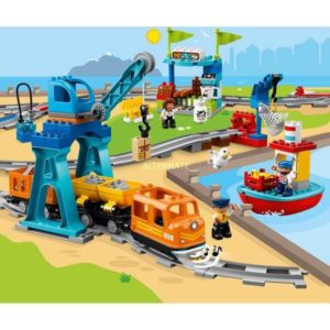 - Inhalt/Ausstattung: Enthalt einen Güterzugführer, einen Kapitän, einen Ladenbesitzer und eine Seemöwe als Figuren. Weiteres Zubehör: Lock mit Lichtern und Geräuschen, zwei Güterwaggons mit Kippfunktion, Kran und Boot, ein großer Kran, ein Café, 24 Eisenbahnelemente mit Weichen, Steigungen, einer Kreuzung und Prellböcken, eine Zapfsäule, eine Kaffeemaschine, eine Tasse, ein Schokoriegel, eine Milchflasche, ein Fischernetz, Brot, Bananen, ein Paket, eine Kasse, ein Schraubenschlüssel, ein Fisch und eine Speisekarte. Der Güterzug ist mit Güterwaggons 10 cm hoch, 47 cm lang und 8 cm breit. Der Verladebahnhof ist 18 cm hoch, 15 cm breit und 13 cm tief. Der große Kran ist 35 cm hoch, 16 cm breit und 16 cm tief. Das Boot ist 17 cm hoch, 19 cm lang und 13 cm breit.