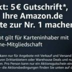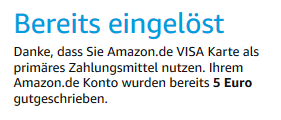 Bei Amazon gibt es gerade 5€ geschenkt wenn ihr Eure Prime Visa Karte zur Nr. 1 Zahlungsart definiert. Hat bei mir hervoragend funktioniert und sind leicht verdiente 5€ 🙂