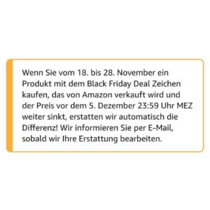 Wenn ihr vom 18.11. bis 28.11.2022 ein Produkt das von Amazon verkauft und versendet wird und mit dem Banner „Black Friday“ versehen ist, kauft, dann erhaltet ihr die Differenz automatisch zurück, falls der Preis bis 05.12.2022 weiter sinkt.