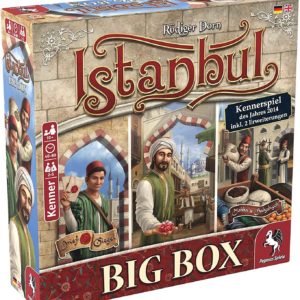 In Istanbul, dem „Kennerspiel des Jahres“ 2014, bewegen sich die Spieler als eifrige Kaufleute durch das Basarviertel. Wer sich hier gleich kopfüber ins rege Treiben stürzen möchte, der kann dies mit der Istanbul: Big Box tun. Dieses Komplettpaket enthält das Grundspiel und beide Erweiterungen und ermöglicht dadurch das Spiel auf einem 5×5-Felder großen Basar.