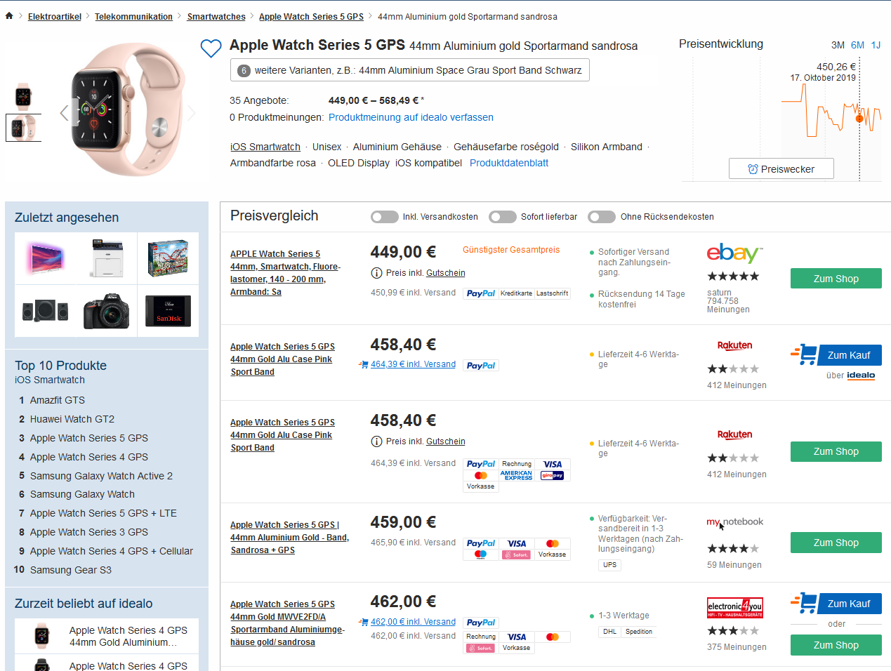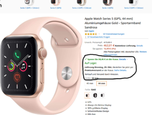 Bei Amazon -59,46 € an der Kasse bekommt man derzeit die Apple Watch Series 5 (GPS, 44 mm) Aluminiumgehäuse Gold – Sportarmband Sandrosa für 402,55 statt PVG ab 451,00 Euro inkl.Versand