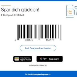 Der Rabatt ist einmalig bis zu einer Tankung von 50 Liter bis zum 31.10.2020 einlösbar. Eine Barauszahlung ist nicht möglich. Autobahntankstellen nehmen grundsätzlich nicht teil. Der Coupon gilt nicht bei Zahlung mit einer Routex Karte. Erdgas ist von der Aktion ausgeschlossen. Der Rabatt errechnet sich anhand des jeweils zum Zeitpunkt der Transaktion gültigen vor Ort Säulenpreis. Aral Coupons sind nicht miteinander kombinierbar.