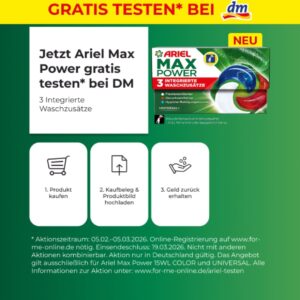 Du wolltest Ariel MaxPower schon länger ausprobieren? Jetzt ist der perfekte Moment dafür, ganz ohne Risiko. Bei dieser Testaktion bekommst du den Kaufpreis vollständig zurückerstattet. Einfach kaufen, hochladen, Geld zurück, so simpel kann Produkttesten sein. Die Aktion gilt exklusiv für Einkäufe bei dm in Deutschland. Perfekt, wenn du dein Waschmittel sowieso nachkaufen musst und dabei sparen willst. Schnell sein lohnt sich, denn pro Person ist nur eine Teilnahme möglich.