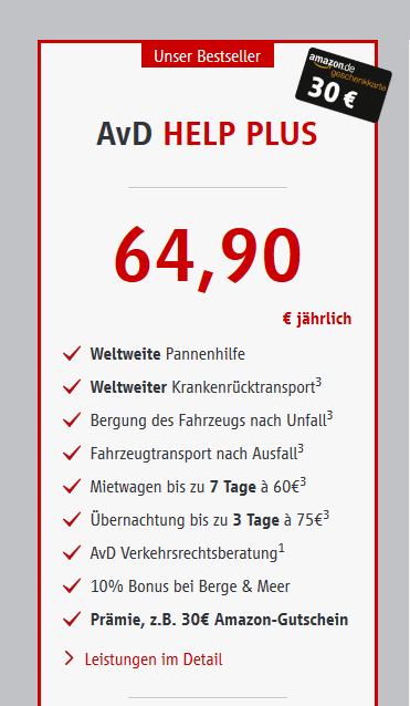 Gast (Gast) 23.06.2019, 16:41 #Du bist kein Fahranfänger, möchtest aber dennoch nicht auf diese zusätzliche Sicherheit verzichten? Aktuell gibt es für den Abschluss einen 30-Euro-Amazon-Gutschein als Prämie.