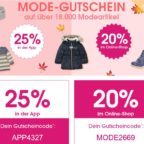 *Der 20%-Aktionsgutschein MODE2669 ist im Online-Shop und in der babymarkt.de-App und der 25%-Aktionsgutschein APP4327 ausschließlich in der babymarkt.de-App einlösbar. Die Aktionsgutscheine sind am 21.10.2020 einmalig auf Produkte der Kategorie ‚Mode‘ anwendbar. Ausgeschlossen sind Geschenkgutscheine, Bücher und Artikel einzelner Hersteller. Barauszahlung oder Kombination mit anderen Rabattaktionen ist nicht möglich. Bei Verwendung des Aktionsgutscheins gelten unsere AGB, hier insbesondere Ziff. 5.
