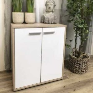 Schlicht und praktisch ist diese tolle Kommode in attraktiver frischer Optik. Die ca. 60 x 70 x 30 cm (B x H x T) große Kommode aus Holzwerkstoff in Eiche Sonoma und Perlweiß bietet Ihnen nützlichen Stauraum für viele Wohnbereiche und passt dank des neutralen Designs zu vielen Einrichtungsstilen. Silberfarbene Griffleisten fügen sich harmonisch ins Gesamtbild ein. Die Kommode mit 2 Drehtüren verfügt über 1 Einlegeboden.