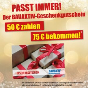 Beim Kauf eines Bauaktiv Geschenkgutscheines im Wert von 75 Euro muss man nur 50 Euro bezahlen. Das Angebot gilt nur bis zum 23.12.2025.