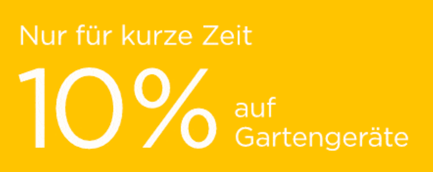 Der Rabatt ist gültig für das Sortiment Gartengeräte bis 24.04.2019. Nicht kombinierbar mit anderen Vorteilen. Keine Barauszahlung und keine nachträgliche Verrechnung möglich.