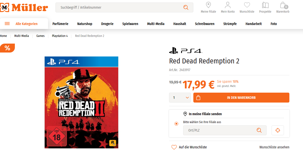 Derzeit bei Müller Online bekommt man die PS4 Red Dead Redemption 2 für 19,99 statt PVG ab 29,85 Euro wie immer bei Müller bei Abholung Filiale.