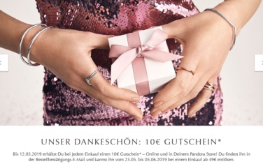 Bis 12.05.2019 erhältst Du bei jedem Einkauf einen 10€ Gutschein* – Online und in Deinem Pandora Store! Du findest ihn in der Bestellbestätigungs-E-Mail und kannst ihn vom 23.05. bis 05.06.2019 bei einem Einkauf ab 49€ einlösen.