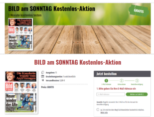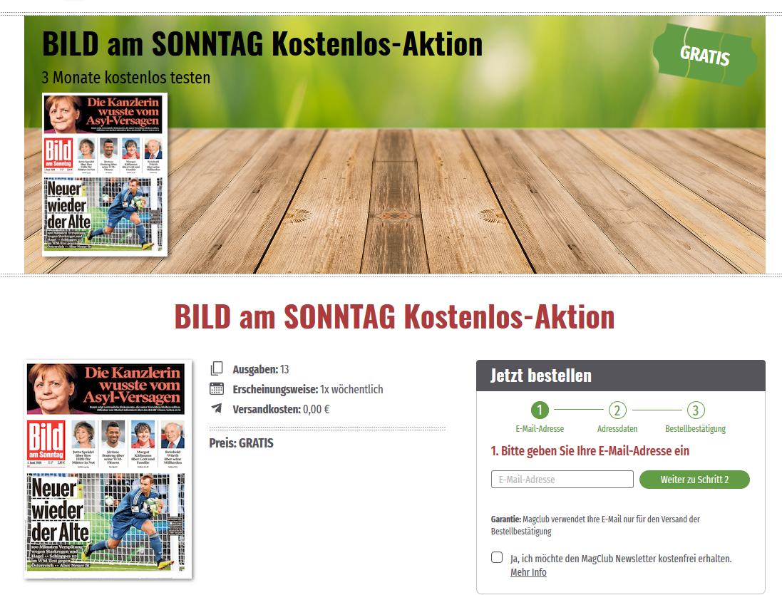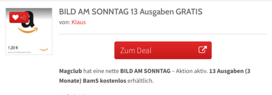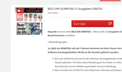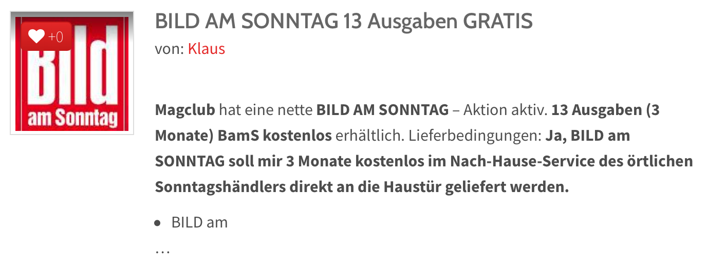 Magclub hat eine nette BILD AM SONNTAG – Aktion aktiv. 13 Ausgaben (3 Monate) BamS kostenlos erhältlich.