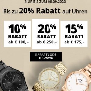Bis zum 08.09.2020 entscheiden Sie mit dem Rabattcode Uhr2020 selbst, wie viel bei Ihrem Uhren-Kauf gespart wird: 10 % Rabatt ab € 100,- Einkaufswert, 15 % Rabatt ab € 175,- Einkaufswert oder 20% Rabatt ab € 250,- Einkaufswert – je höher der Einkaufswert, desto höher ist auch Ihr Rabatt! Geben Sie einfach den Rabattcode im Warenkorb ein: Uhr2020 Das Angebot gilt nur bis zum 08.09.2020, nur online und solange der Vorrat reicht. Nicht mit anderen Aktionen/Rabattcodes kombinierbar. Angebot gilt nur auf die unten dargestellten Produkte