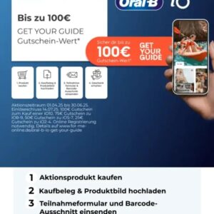 Wer sich aktuell eine neue elektrische Zahnbürste der Marke Oral B, Series I O „gönnt“ kann den Kassenzettel einsenden und einen Gutschein von Get your Guide, in Höhe von bis zu 100 Euro bekommen ! 😮