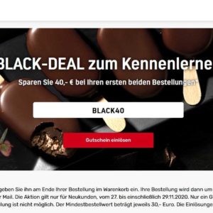 Eismann hat einen BLACK DEAL zum Kennenlernen (Rabattcode: BLACK40). Damit kann man vom 27.11-29.11.2020 insgesamt 40€ auf die ersten beiden Bestellungen sparen (20€ auf die erste Bestellung und weitere 20€ auf die zweite Bestellung).