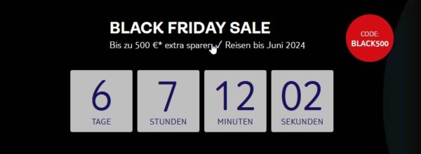 Mit dem Code: BLACK500 gibt es bis zu 500 € Sofortrabatt* für Pauschalreisen.