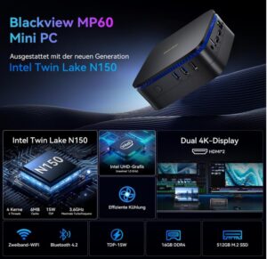 - 【2025 Intel N150 Chip – 20% mehr Leistung & Sekundenstarts】Blackview MP60 N150 Mini PC mit Intels neuestem Office-Chip (Intel-7-Architektur) ist 20% leistungsstärker als der N100. Er garantiert flüssiges Arbeiten mit Tabellen, Textverarbeitung oder Videobearbeitung – ohne lästige Verzögerungen oder Ruckler