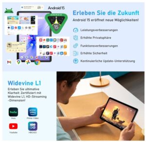 - Widevine L1 + 1280*800 HD+ Dual-Lautsprecher: Dank der Widevine L1 Dekodierungstechnologie genießen Sie ein klares und lebendiges Seherlebnis auf dem HD+ Bildschirm mit einer Auflösung von 1280*800. Die Dual-Lautsprecher sorgen für einen reichhaltigen Stereo-Sound und bieten Ihnen ein immersives Audio-Erlebnis.
