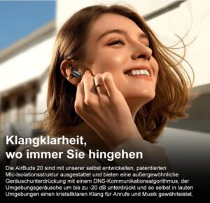 - 𝐌ü𝐡𝐞𝐥𝐨𝐬𝐞 𝐓𝐨𝐮𝐜𝐡-𝐒𝐭𝐞𝐮𝐞𝐫𝐮𝐧𝐠 𝐮𝐧𝐝 𝐞𝐫𝐠𝐨𝐧𝐨𝐦𝐢𝐬𝐜𝐡𝐞𝐬 𝐃𝐞𝐬𝐢𝐠𝐧:Die AirBuds 20 verfügen über eine benutzerfreundliche Touch-Control-Funktion. Sie können die Oberfläche des Kopfhörers berühren, um Lieder zu wechseln, Anrufe anzunehmen, die Lautstärke zu steuern und mehr. Das ergonomische Semi-In-Ear-Design bietet maximalen Komfort, sodass Sie beim Tragen fast vergessen, dass Sie Kopfhörer nutzen. Die geschlossene Bauweise isoliert Außengeräusche und verbessert die Bassleistung.