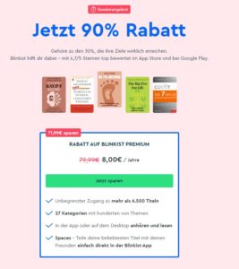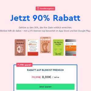 Aktuell erhaltet ihr zum Jahresbeginn einen 90% Rabatt auf die Jahresmitgliedschaft bei Blinkist! (0,67€ im Monat – 8€ im Jahr).