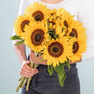 Keine Blume stellt die schönste Zeit des Jahres besser dar als die Sonnenblume. Ursprünglich stammt die beeindruckende Blume aus Nord- und Mittelamerika. Bei den Indianern galt sie als heilige Pflanze und im 16. Jahrhundert wurde sie durch spanische Seefahrer nach Europa gebracht. Seitdem ist sie der Inbegriff der Sommerblumen. Ihre großen Blüten sind mit strahlend gelben Blütenblättern gekränzt und leuchten wie die Sonne selbst. Bei diesem zauberhaften Anblick kommt die gute Laune ganz von alleine. Das prachtvolle Bund Sonnenblumen besteht aus zehn kräftigen Stielen mit üppigen Köpfen – ein schöner Blumengruß, um jemandem Danke zu sagen. Verbreite gute Laune und überrasche einen lieben Menschen mit diesem fröhlichen Bund.