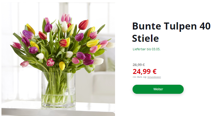 lemalix 02.04.2019, 09:07 #Ihr bekommt zum Beispiel 40 Tulpen für 26,23€ inkl. Versandkosten statt 31,98€ (normalpreis zzgl. Versand)