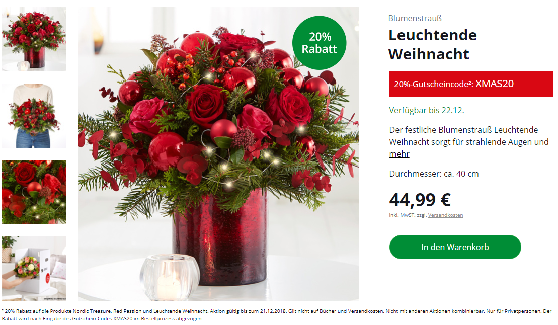 Die Aktion ist bis 21.12.2018 gültig und die Sträuße nur bis zum 22.12.18 verfügbar.