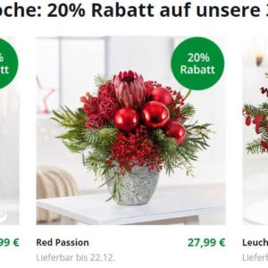 Bei Blume2000.de erhalten Sie 20% Rabatt auf 3 ausgewählte Weihnachtliche Blumensträuße mit dem GutscheinCode XMAS20.