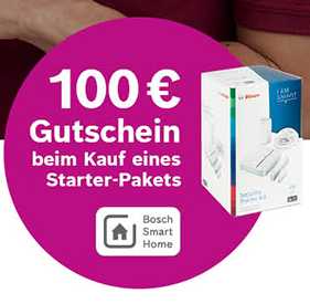 Wer im Zeitraum vom 01.10.2019 bis 31.01.2020 ein beliebiges Bosch Smart Home Starter-Paket aus dem Bereich Sicherheit oder Raumklima kauft, erhält einen 100 € Gutschein für unseren Onlineshop.