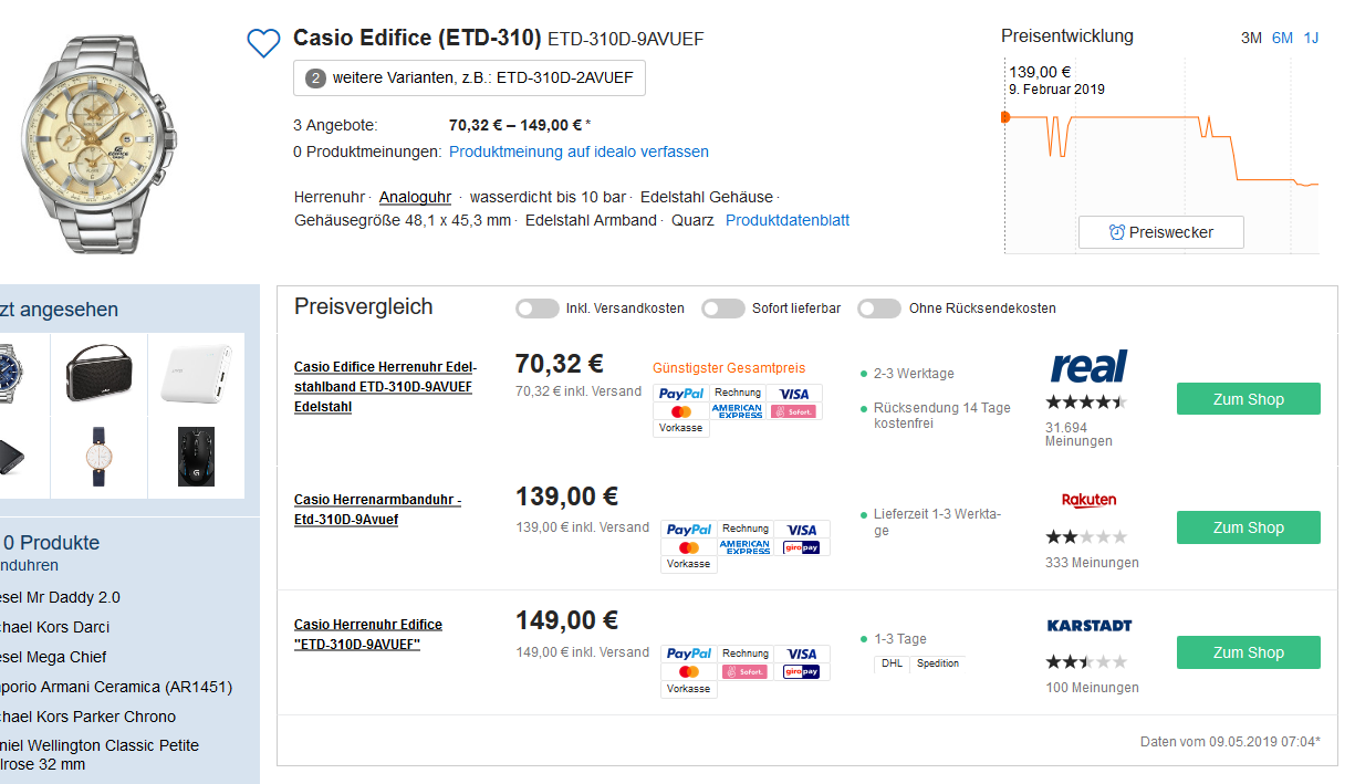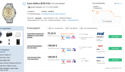 Tip bei real: Casio Edifice Herrenuhr Edelstahlband ETD-310D-9AVUEF Edelstahl für 70,32 PVG ab 139,00 Euro inkl.Versand.