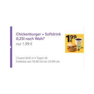 Guten Abend! Heute bekommt ihr mit der McDonald’s App ein Chicken-Burger + ein Softdrink 0,25l nach Wahl für 1,99€ statt 3,18€. Der Coupon ist nur einmal einlösbar und gültig bis zum 19.04.2019.