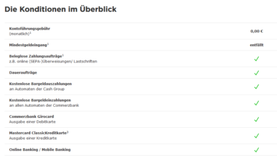 1* Kostenlos nur bei privater Nutzung, bei belegloser Kontoführung und Nutzung von Commerzbank-/ Cash Group-Geldautomaten. Es fallen 1,50 € je Vorgang/Scheck für beleghafte Inlands-/SEPA-Überweisungen, Einzug von auf Euro ausgestellten Inlands-Schecks, sowie je Bargeldaus- und Bargeldeinzahlung am Schalter der Commerzbank an.