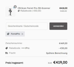 Nice! Endlich habe ich mal einen 3D-Scanner mit Rabatt gefunden, bei Crealtiy Store bekommt ihr den CR-Scan Ferret Pro 3D-Scanner für 419€.