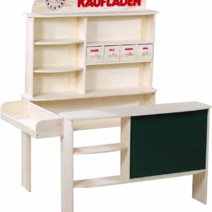 …heißt es fortan im Marken-Kaufmannsladen aus Holz, Enthält Uhr mit beweglichen Zeigern, mit integrierter Tafel, 4 Holzschubladen und seitlicher Theke.
