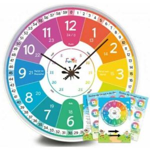 Mit der Uhrzeit lernen kann man nie früh genug anfangen zu lernen. Die Zahlen von 0 bis 24 sollten die Kinder natürlich schon beherrschen. Aber wer das drauf hat, kann sich die Wanduhr für Kinder Funtini Kinder Lernuhr-Set lautlos Uhrzeit lesen lernen XXL Wanduhr Ø50cm holen und mit dem Lernen beginnen.