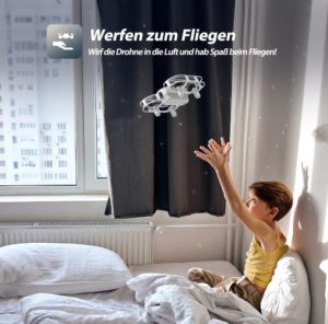 - Wirf sie nach oben und die Drohne hebt sofort ab. Die Bedienung ist mühelos! Natürlich kannst du die Drohne auch per Fernsteuerung mit nur einem Knopfdruck Starten oder Landen. Gut geeignet für Kinder und Anfänger.