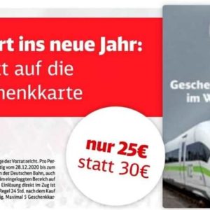 Zeitraum des Angebots ist 28.12.2020 bis zum 09.01.2021, pro Einkaufsvorgang einer Bahnfahrkarte sind max. 5 Karten einlösbar. Die Karte ist nach dem Kauf 5 Jahre gültig.