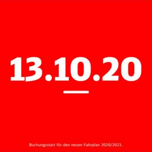 Fahrkarten ab dem 13.12.20 können ab dem 13.10.20 gebucht werden.