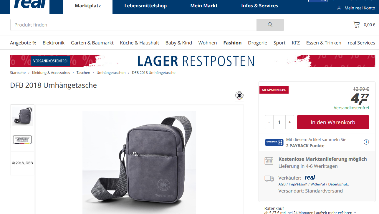 Bei real als Restposten den DFB 2018 Umhängetasche für 12,77 stat UVP 20,00 Euro inkl.Versand.