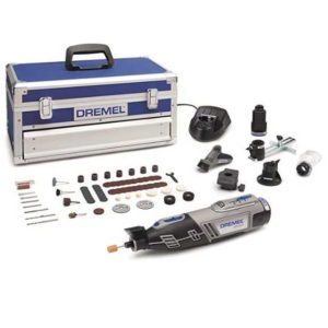 - Lieferumfang: Dremel 8220, 2x 2,0 Ah Akku, 65 tlg. Zubehör, Präzisionshandgriff, Modellierungstisch, Kreis-und Parallelschneider, Fräsvorsatz, Schutzhauben-Vorsatz, Ladegerät, Aluminium-Werkzeugkoffer